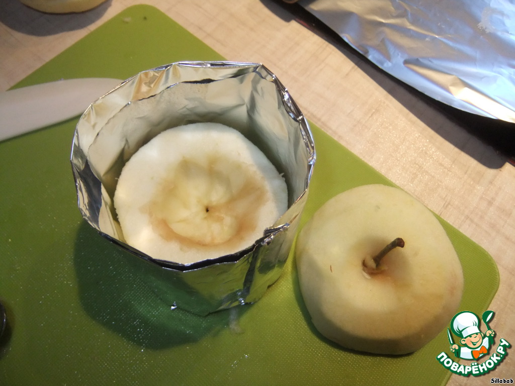 Подготовленное яблоко-формочку выкладываем в железную форму-кольцо. Если у вас нет таких колец, то можно использовать готовые одноразовые формочки для запекания из фольги, просто срезать у них ножом дно. Или, как сделала я, сложить фольгу в несколько слоев и сделать кольцо.