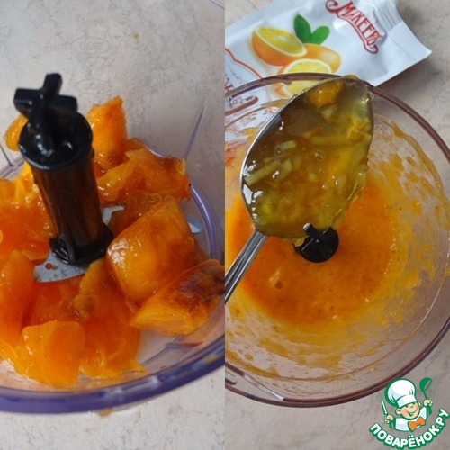 Хурму очистить от кожицы-пленки и удалить косточки (если таковые имеются). Мякоть (примерно 150г) поместить в чашу блендра, добавить 1 ст. л апельсинового джема, измельчить до однородности.