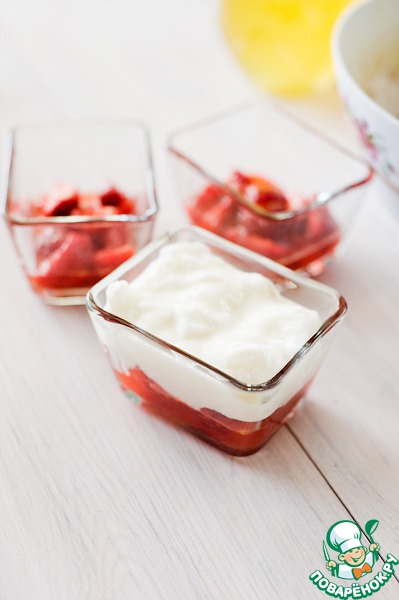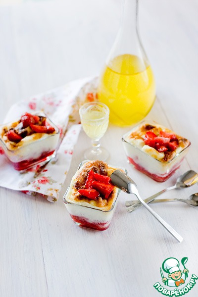 | Маринованная в ликере клубника под невесомой шапкой творожного суфле. Очень вкусный и очень нежный десерт! |