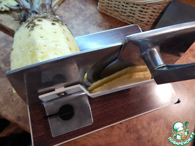 Ананас хорошенько моем, очищаем и нарезаем слайсером на тонкие ломтики (можно и ножом, но очень острым).