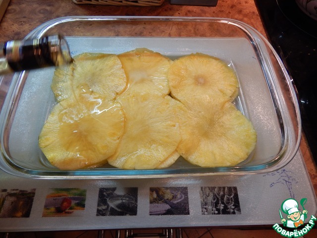 Пласты ананаса выкладываем в плоское блюдо, заливаем коньяком.