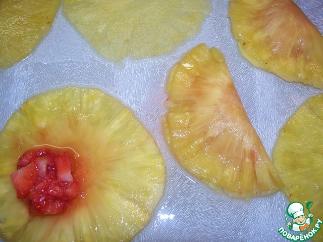 Выкладываем ананасы на доску. Внутрь каждого выкладываем начинку и прижимаем края.