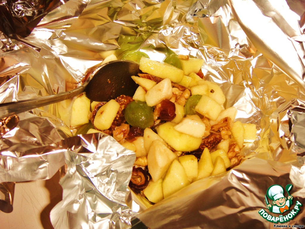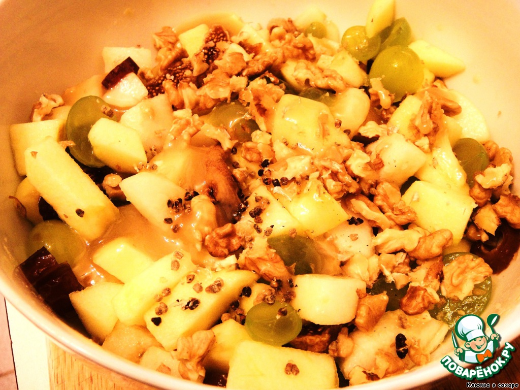 В миску с фруктами достаточно крупно крошим грецкие орехи и высыпаем семена кардамона. Ещё раз всё перемешиваем.
