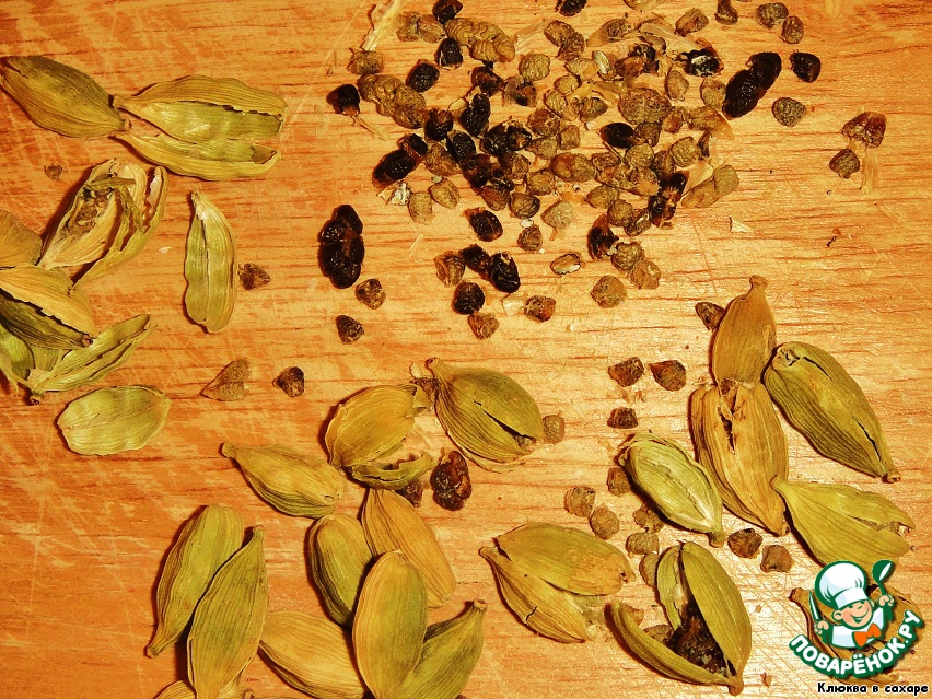 Мне повезло достать целые плоды кардамона на базаре специй. При помощи молоточка достаём из них семена. Если кардамон уже в семенах или молотый, то этот шаг можно пропустить.