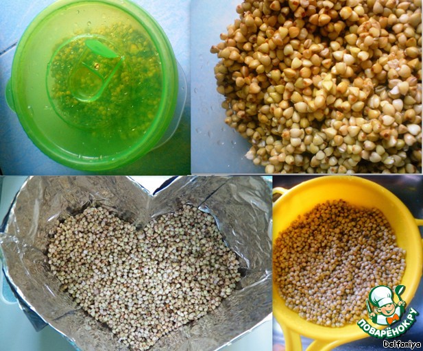 За ночь перед приготовлением салата гречку (1 стакан) замочим двумя стаканами воды. Утром мы увидим, что всю или почти всю воду (в зависимости от влажности/сухости воздуха вашего жилища) она впитала. Дальше для проращивания ее нужно промывать в сите два-четыре раза в сутки и оставлять снова в тепле, можно проращивать в холодильнике, но это будет медленнее. Я обычно ем просто замоченную.