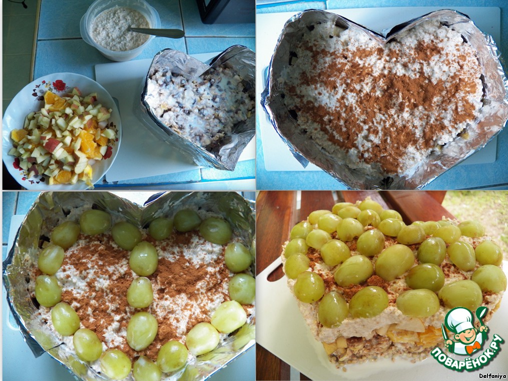 Нарезать помельче фрукты, выложить их поверх мюсли. Дальше выкладываем хлопья с йогуртом. Можно посыпать корицей. Украшаем половинками винограда.