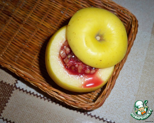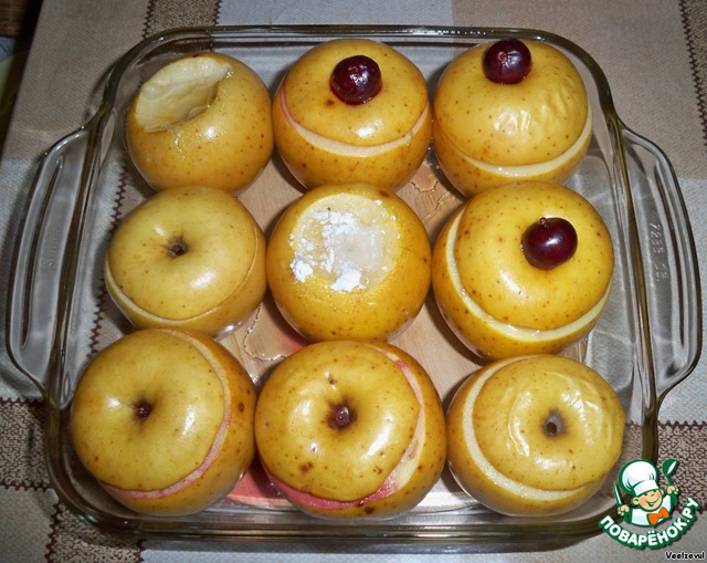Получившейся начинкой начиняем 2 яблока, накрываем крышечкой. А в ямочку ложем вишенку, для контраста (вишня пустит красный сок и слегка окрасит начинку и яблоко).