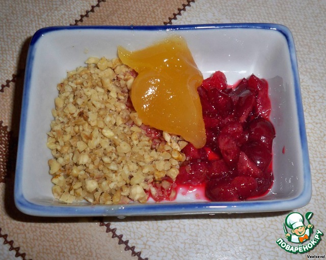 Готовим [color=red]вторую начинку[/color]. Для этого нарезаем на 4 части вишню добавляем мед и столовую ложку орехов.