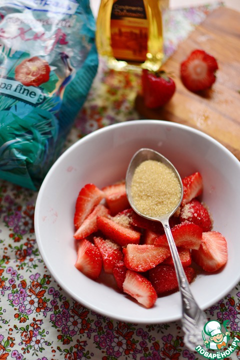 Клубнику помыть, отрезать плодоножку, нарезать на четвертинки. Засыпать сахаром, добавить уксус и оставить мариноваться на 10 минут.