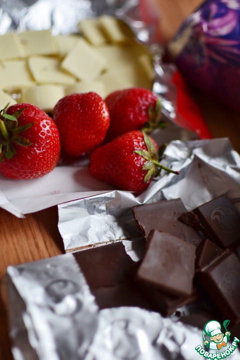 Половину йогурта - 200 гр. смешать с тёмным шоколадом, половину - с белым. Клубнику разложить по порционным стаканам и сразу залить шоколадной массой. Оставить до полного охлаждения.