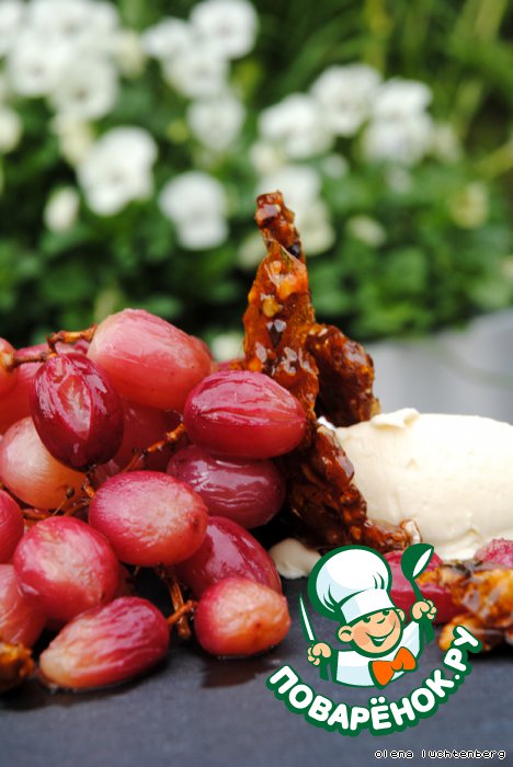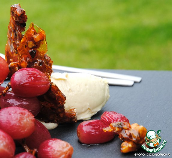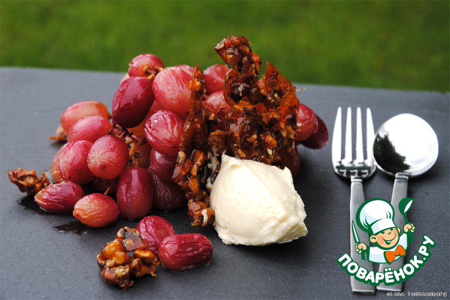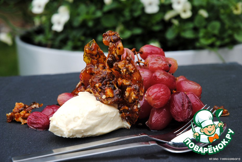На тарелку положить еще теплый виноград, маскарпоне и украсить осколками ореховой карамели. Приятного аппетита!