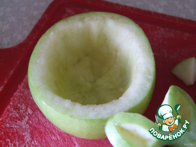 Теперь берем нижнюю часть яблока, нам нужно вынуть оттуда мякоть... Как я уже говорила, набора для карвинга у меня нет, поэтому я делала следующим образом - надрезала ножом по кругу, а потом чайной ложкой пыталась достать мякоть. Главное не прорезать яблоко насквозь.