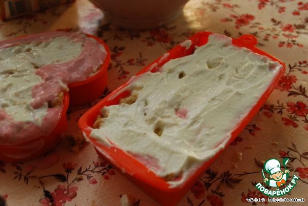 1/2 творожной массы отложить, 1/2 смешать с клубничным пюре.
