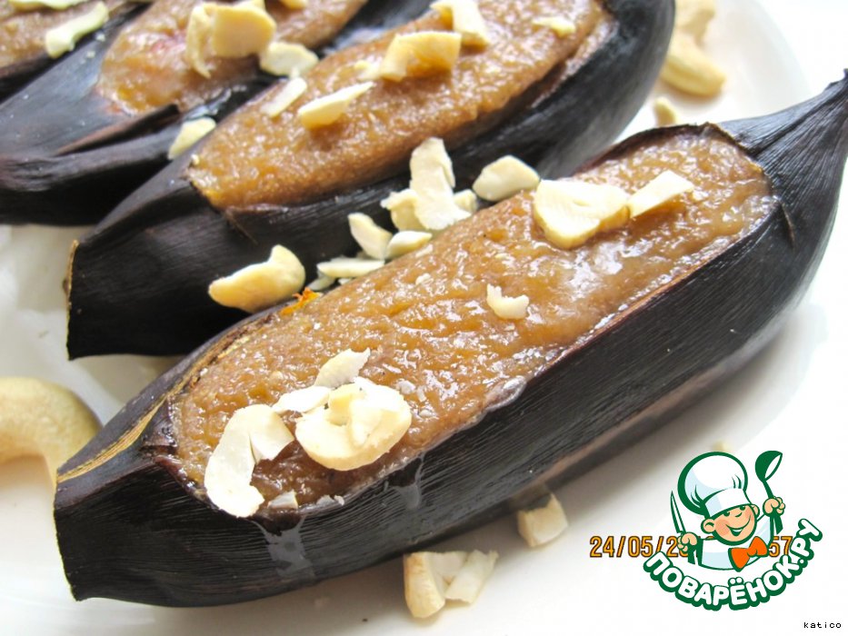 Когда бананы готовы, посыпаем их рублеными орехами.