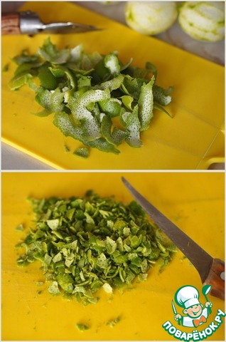 Очистить цедру с лаймов. Лучше сделать это мелкой теркой, но мы легких путей не ищем, и поэтому я сняла цедру овощечисткой, и потом ножом долго-долго измельчала ее.