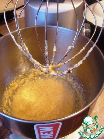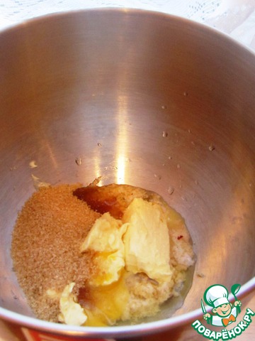 Смешиваем сахар, мягкое масло, растопленный шоколад, ванилин, муку, миндальную крошку, яйца, сливки.