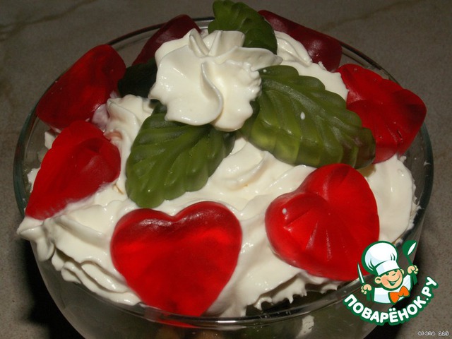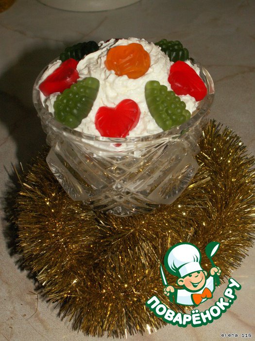 Сверху хорошенько выложить сливки, украсить жевательным мармеладом.