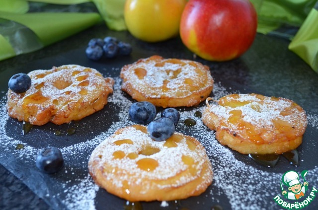 Подготовленные яблоки обмакнуть в тесто и выложить на прогретую сковороду с маслом.