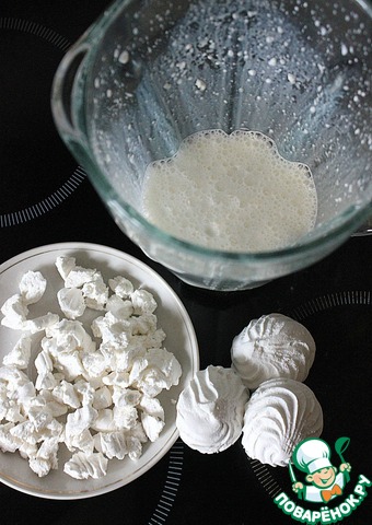 Теперь приготовим мусс. Стакан - 200 мл сливок налить в блендер, понемногу добавлять разломанный на кусочки зефир и взбивать до однородного состояния. Мусс получается сладким, но таким приятным на вкус. Зефир у меня был "Пломбир", поэтому и мусс получился такой - со вкусом сливочного пломбира.