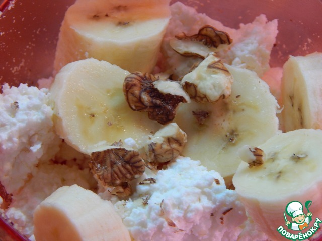 Соединяем творог, банан, часть орехов. Измельчаем.