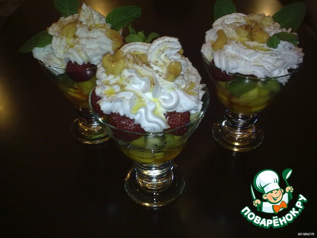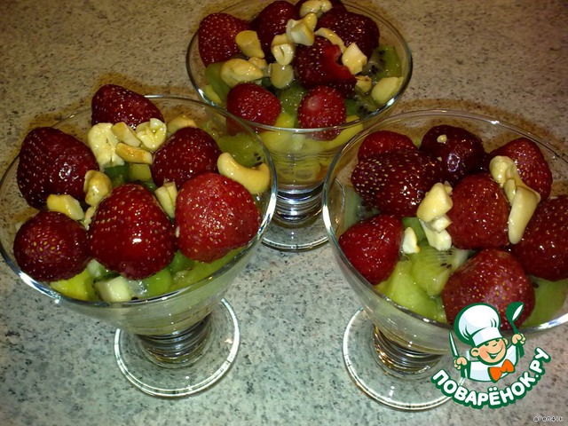 Выложить в креманки манго, киви, клубнику. Полить медом и положить чуточку орехов.