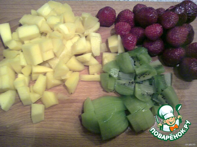 Почистить и нарезать манго, киви. Подготовить клубнику.