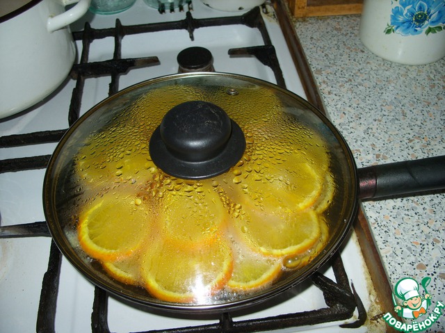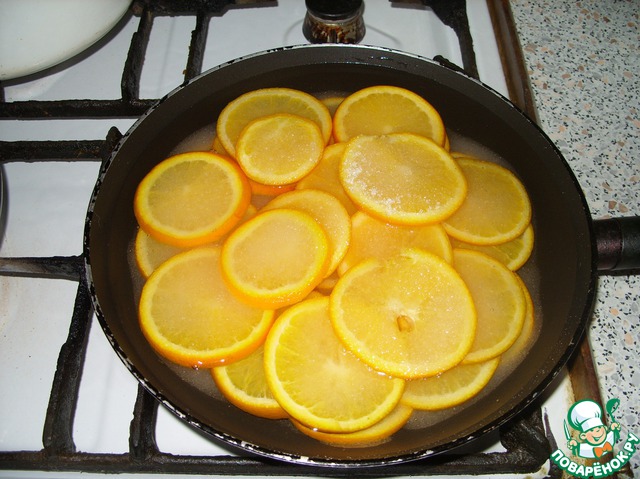 Берем кастрюльку или сковородку, кому что удобно. Засыпаем дно слоем сахара, выкладываем на него слой апельсинов, которые затем тоже засыпаем слоем сахара. Продолжаем выкладывать апельсины в этой же последовательности - постоянно присыпая очередной слой апельсинов сахаром. Примечательно, что последний (финальный) слой должен быть именно из сахара.