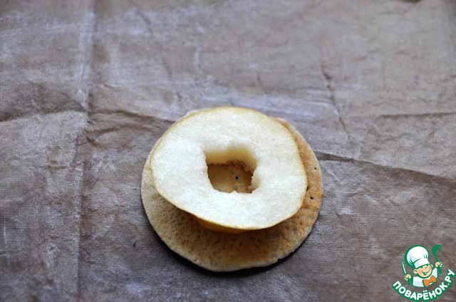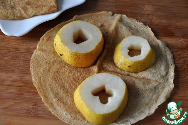 Берём готовые блины, раскладываем на них кружки груш и вырезаем круги диаметром немного больше диаметра груш.