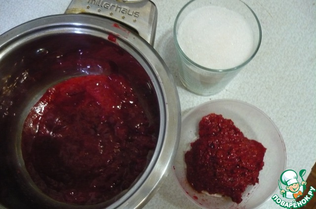 В пюре добавить сахар и уварить до густоты. Так как мы вылили сок в желатин, то на это у меня ушло 5 мин.