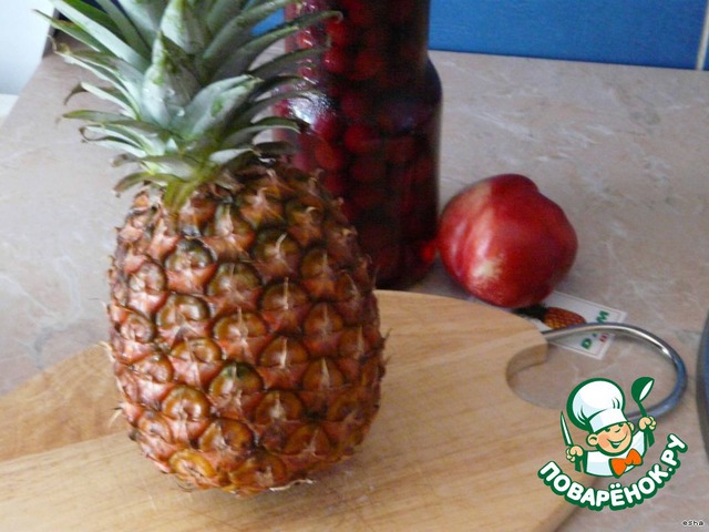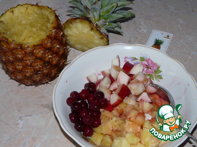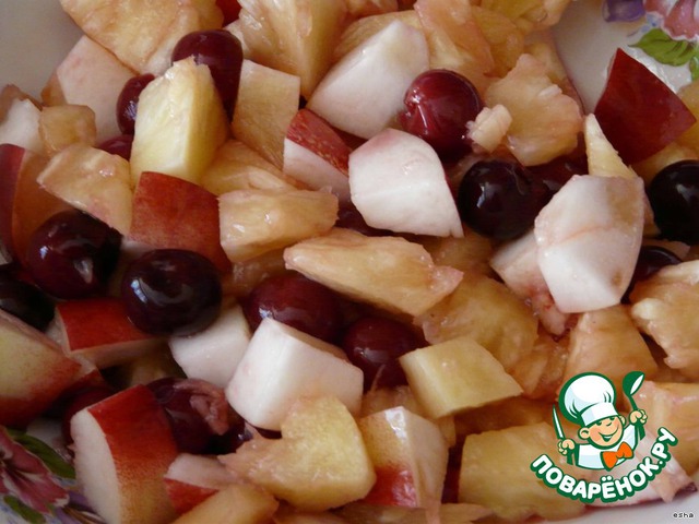 Мякоть ананаса и нектарина порезать кубиками, добавить вишни (без косточек). У меня здесь эти http://www.povarenok.ru/recipes/show/29206/.