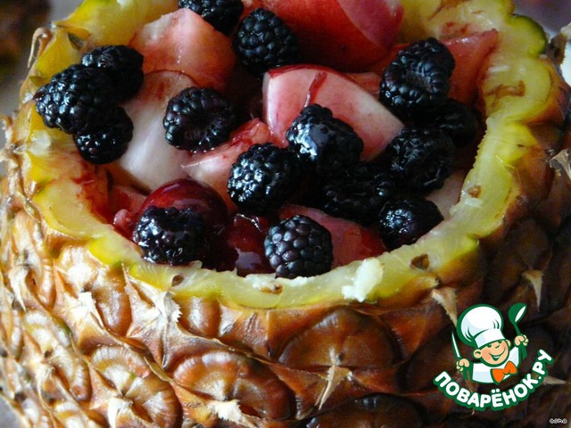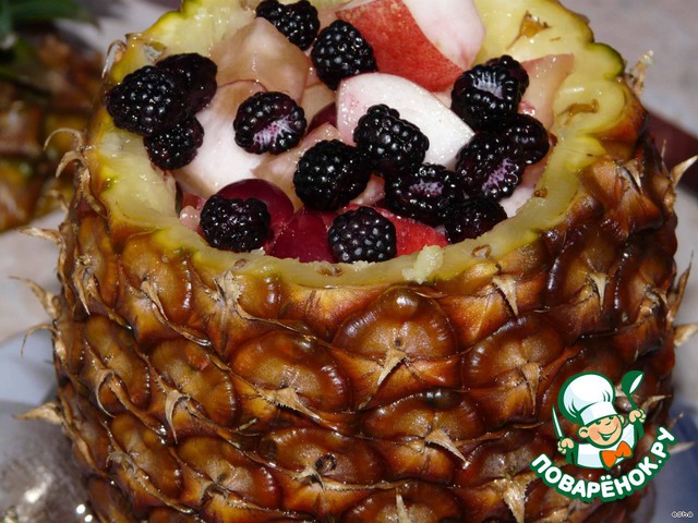 Перед подачей на стол заполнить нашу вазу фруктами, украсить ягодами ежевики, полить сиропом. Начинка в этом ананасе очень запоминающаяся..