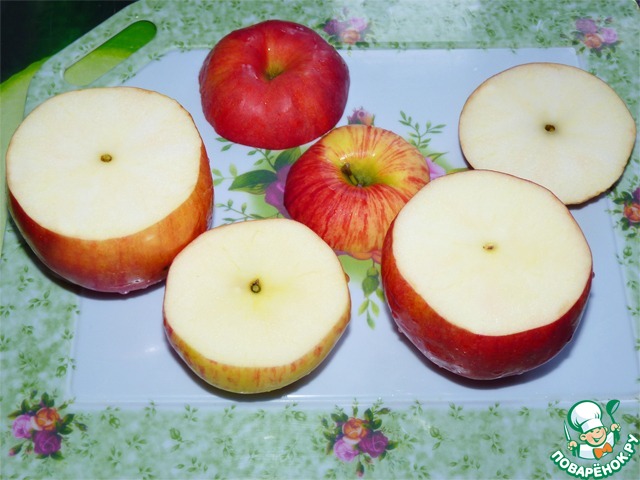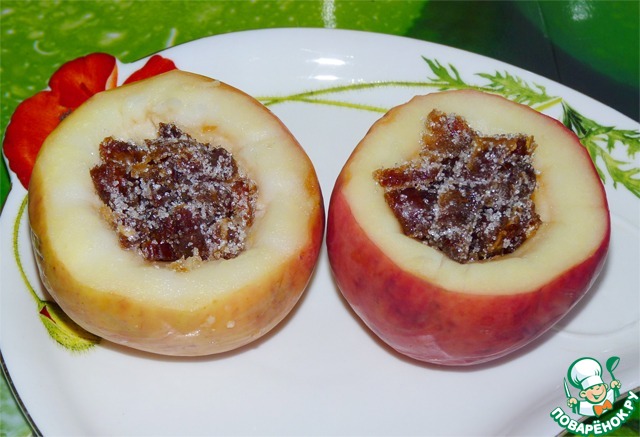 Затем при помощи ножа и ложки вычищаем серединки яблок, чтобы получилась выемка и наполняем начинкой.
