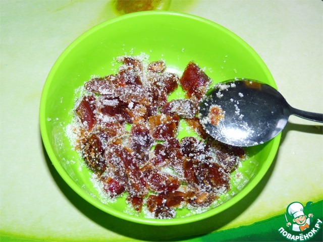 Финики очистить от косточек и нарезать небольшими кубиками, добавить 1 ч. л. сахара и перемешать.