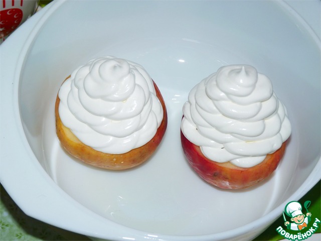 Яблоки сложить в форму и запекать 10 минут при t 180*С, и нужно чтобы белок немного подрумянился.