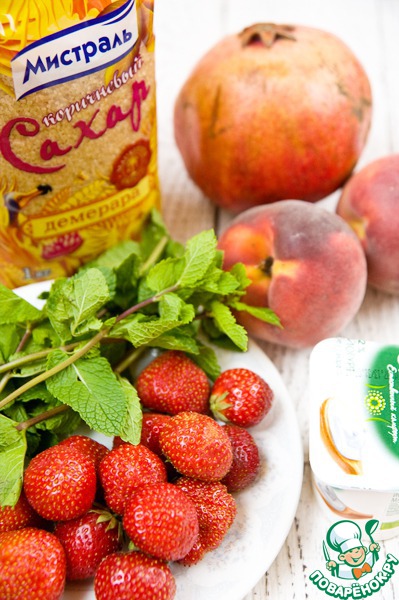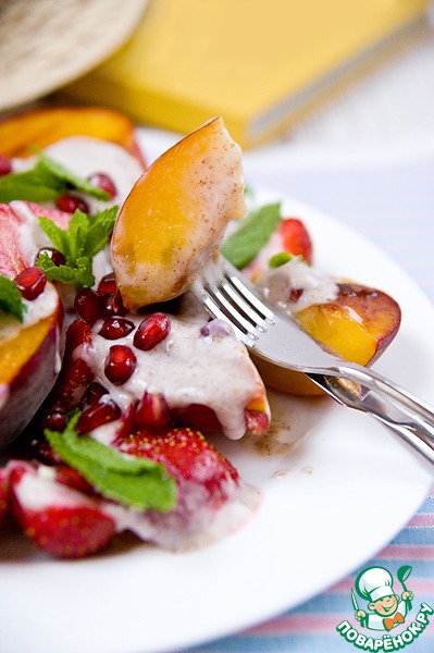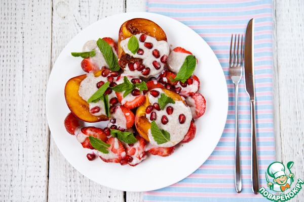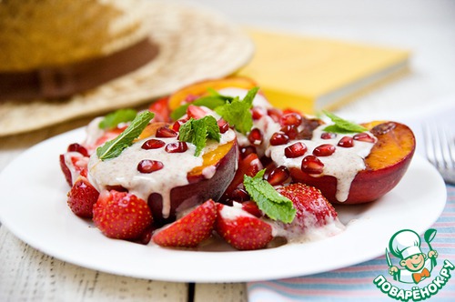 На блюдо выложить гриль-персики, половинки клубники и щедро полить соусом. Сверху посыпать гранатовыми зернами и положить листики свежей мяты.