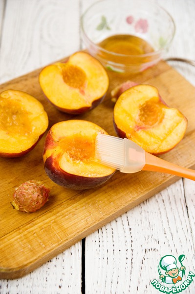 Персики разрезать на половинки, вынуть косточки и смазать срезы медом.