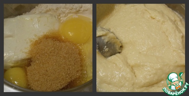 Смешиваем творог, сахар, манку, муку, яйца и разрыхлитель. Дать постоять 10 мин.