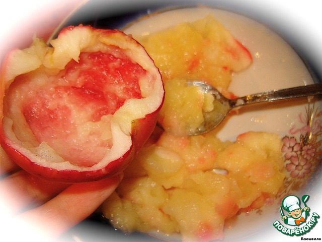 Яблоки станут очень мягкими, но сохранят форму. Ложечкой удаляем мякоть, стараясь не повредить кожицу.