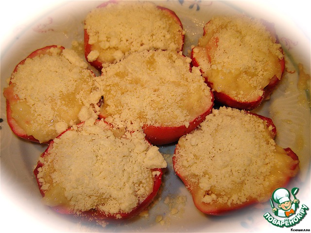 Смешать творог с яблочной мякотью. Наполнить яблоки. Посыпать заранее приготовленной из муки и сливочного масла крошкой и поставить в микроволновку еще на 2 минуты.
