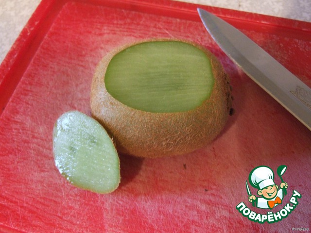 Чайной ложкой вытаскиваем из кожуры мякоть киви. Делаем это осторожно, не повредив кожуру.