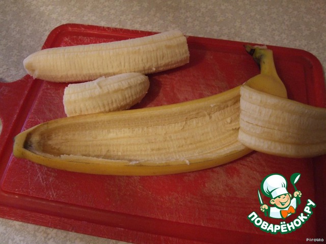 Берем банан, надрезаем ножом сверху кожуру, так чтобы можно было вытащить банан. Вытаскиваем банан, не повредив кожуру, и режем его на мелкие кусочки.