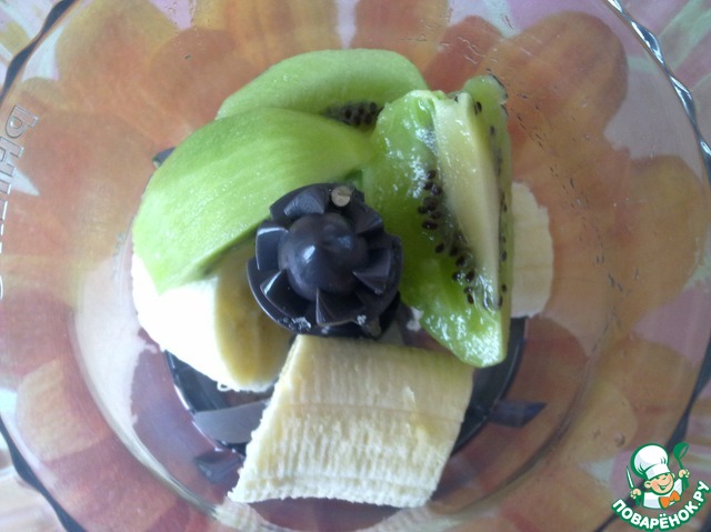 Киви очистить от кожуры, разрезать на четвертинки. Банан очистить и нарезать крупными кружочками. Поместить фрукты в чашу блендера и измельчить.