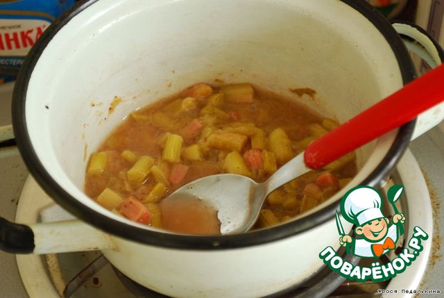 Черешки ревеня очистить от кожицы, порезать на кусочки, добавить воды и корицу, варить до мягкости на небольшом огне, примерно, 5 минут.