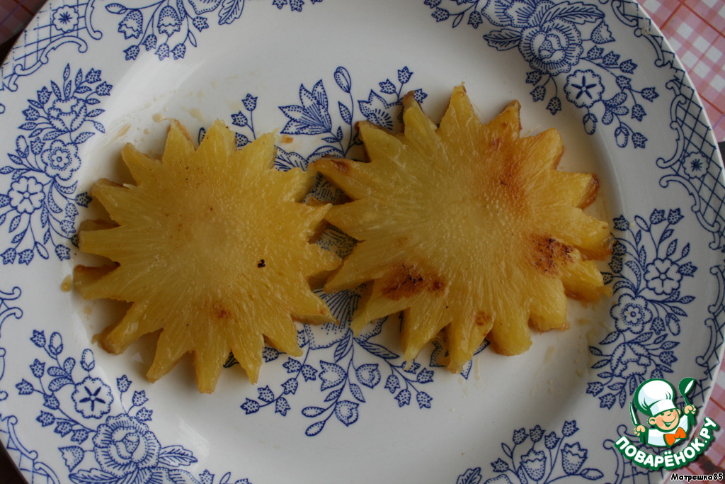 Растопить сливочное масло в сковороде, добавить ванильный сахар, обжарить в нем ананас с двух сторон.