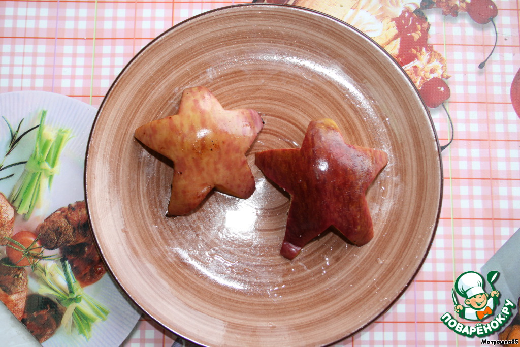 Тем временем яблоко разрезать пополам, вырезать сердцевину, сделать из половинок яблок звезды.