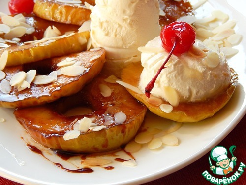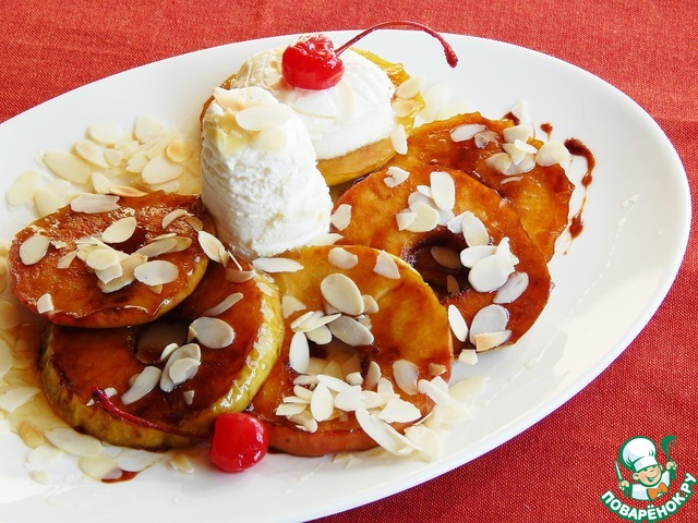 Выкладываем на тарелку, поливаем медом, посыпаем обжаренными миндальными лепестками, добавляем мороженое. Десерт готов!