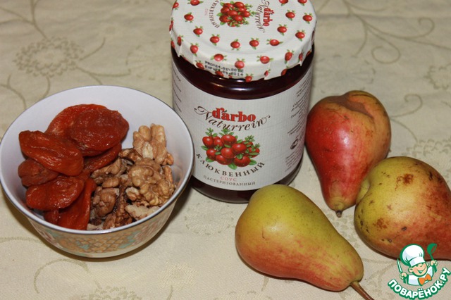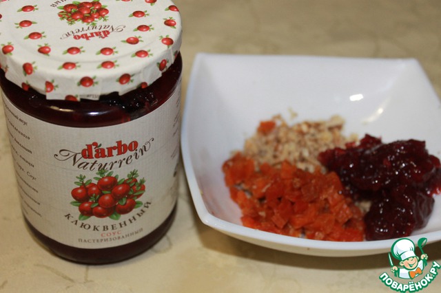 Грецкий орех и курагу порубить ножом, смешать с клюквенным соусом, кардамоном, корицей