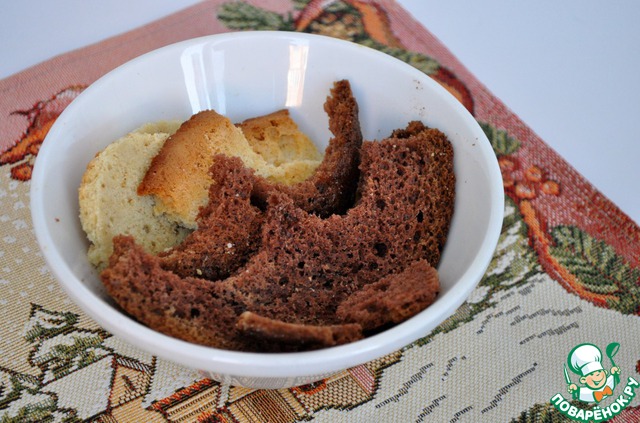 У меня остались кусочки бисквита после приготовления пирожных. Я вырезала формочками кружочки, а обрезки остались. На завтрак я приготовила из них гратен. Кусочки были от шоколадного и белого бисквитов.