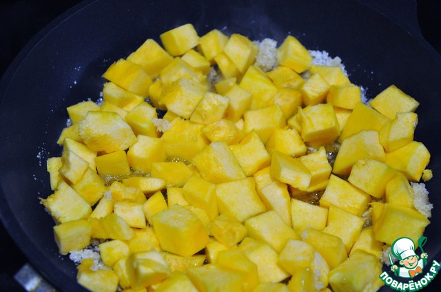 Жарю тыкву в сахаре, сейчас зима, и тыква долго хранилась. A значит, может быть не такая сочная, добавляйте по столовой ложке воды.