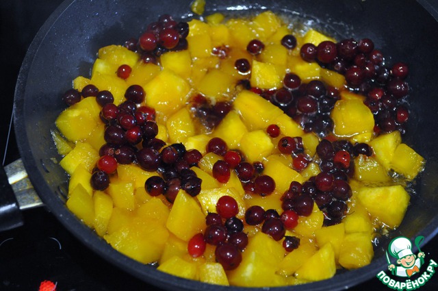 Когда тыква станет мягче, кладу клюкву, корицу и вливаю вино, немного выпариваю и выключаю.
